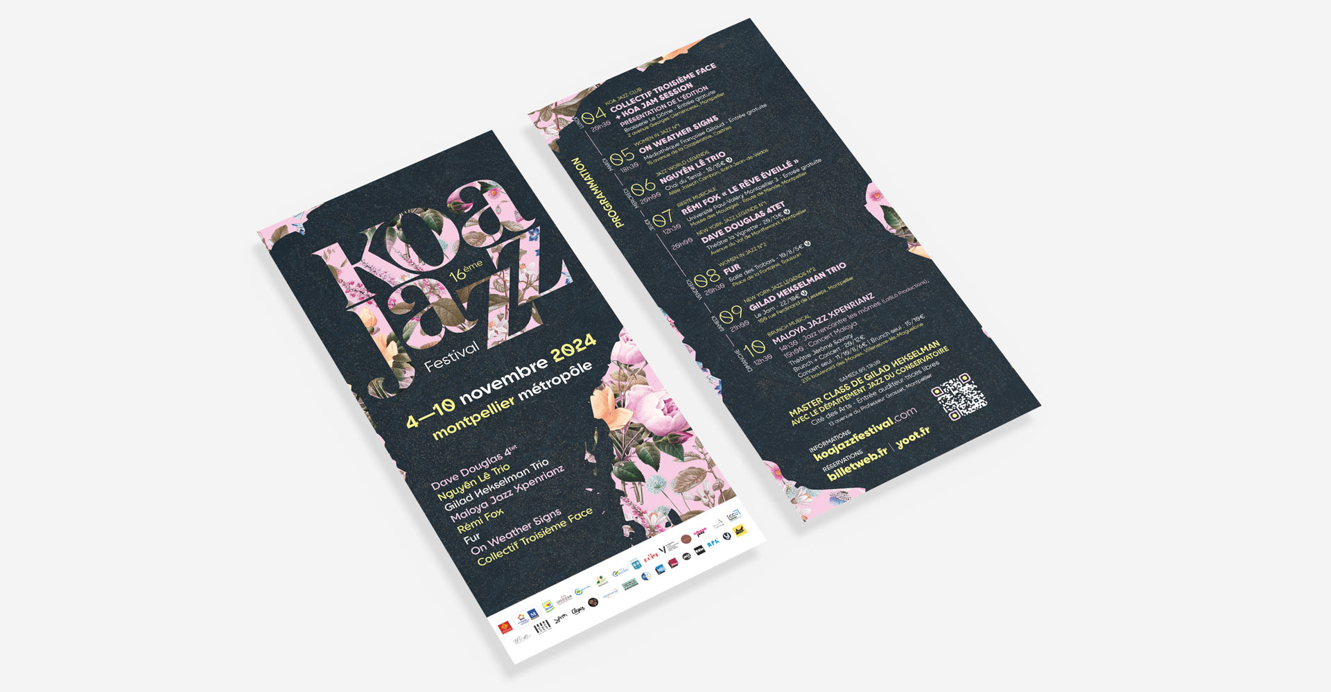 Depuis de nombreuses années, je suis responsable de l’identité graphique du festival Koajazz, basé sur Montpellier.  Affiche, flyer, dépliant, toute la communication imprimée est pensée et créée par mes soins.